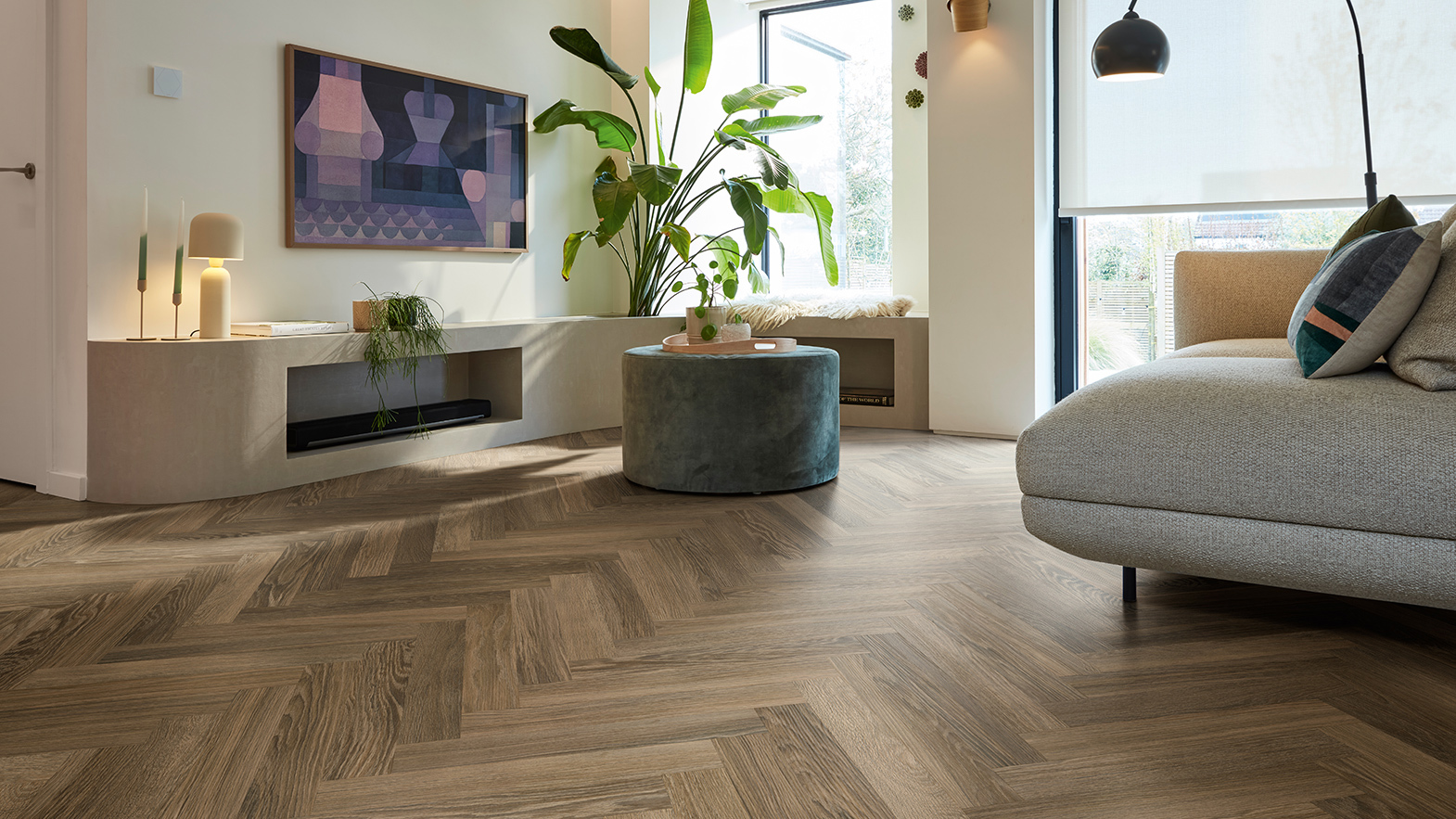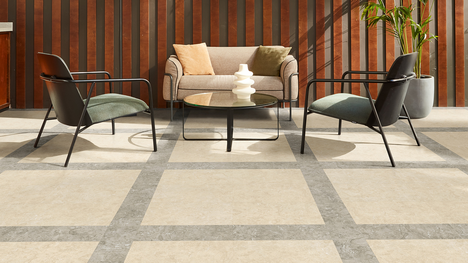 Options like Cocoa Limed Oak, with its timeless deep brown and warm espresso tones, or Lunar Limestone, an understated off-white design with subtle depth and plenty of character, provide a warm and welcoming atmosphere, while flexible laying patterns allow designers to subtly define zones within open-plan areas. For example, a herringbone wood design in a seating nook can differentiate it from a more functional area laid in a straight-lay pattern or in a contrasting stone design.