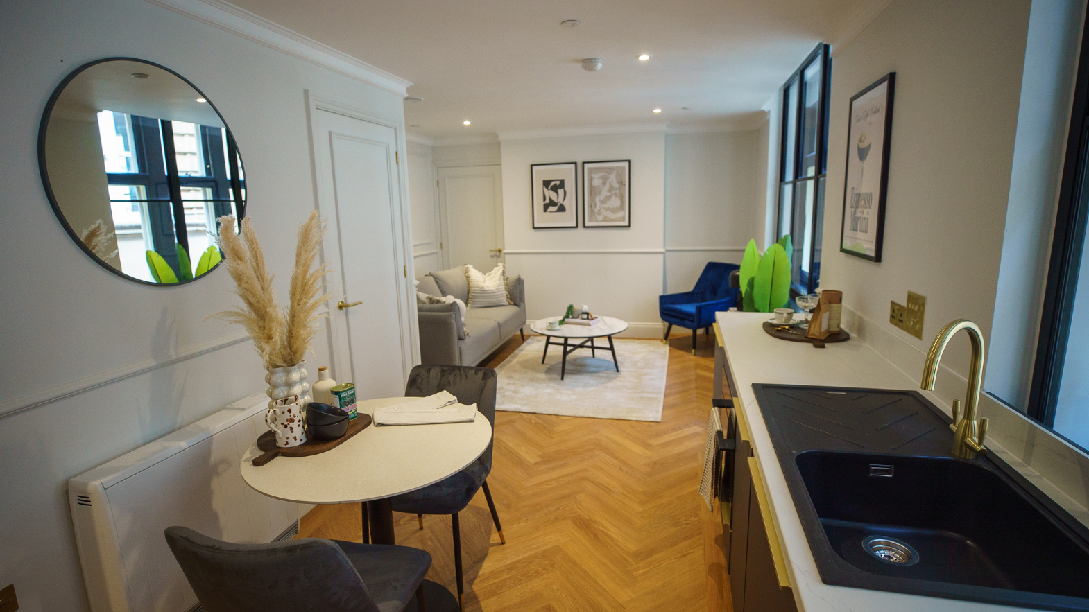 In Manchester’s St Ann’s Square conservation area, three historic office and retail buildings, including one Grade II listed, have been converted into 24 luxury apartments. In keeping with the prestigious location, the brief for the interior was to retain and celebrate the existing period character whilst creating high-end bespoke residential apartments for discerning renters.