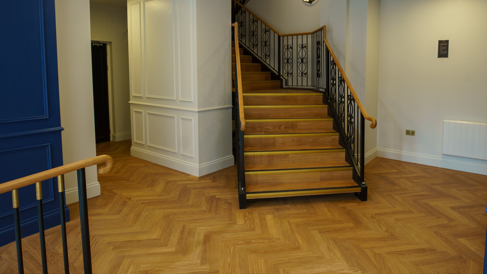 The result is a welcoming, high-end environment with long-term durability. The warm tones of Honey Limed Oak in a classic herringbone pattern and the timeless yet on-trend boldness of Lansdown serve to highlight and enhance the building’s original character.